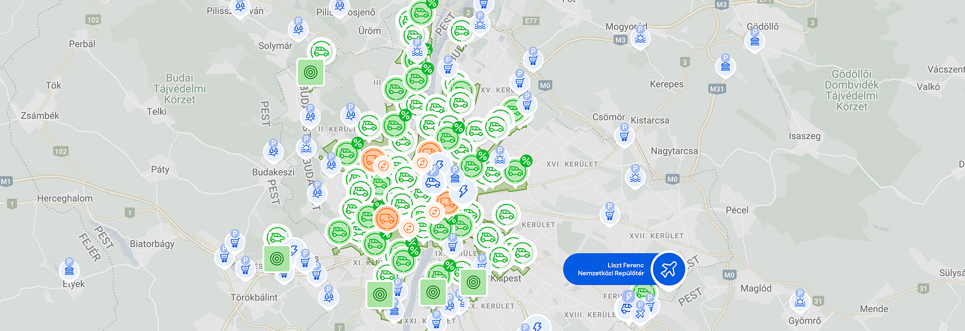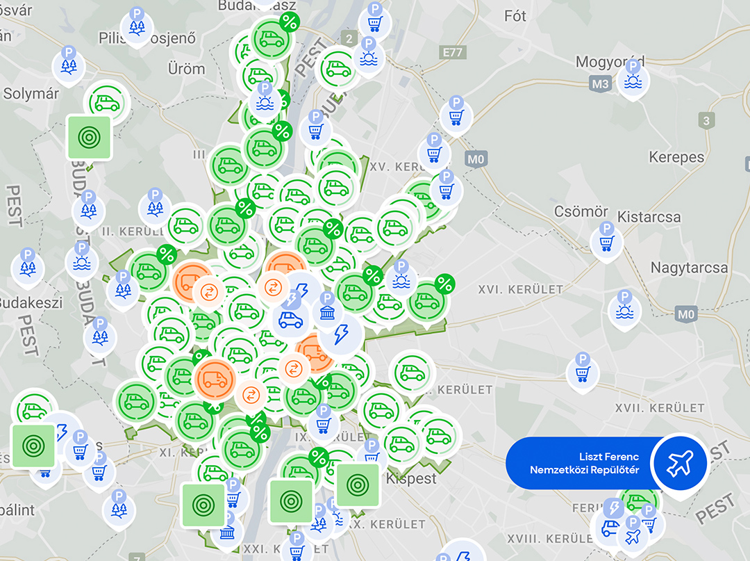 A KÉP CSAK ILLUSZTRÁCIÓ. A ZÓNÁKAT ÉS AZ AUTÓK AKTUÁLIS HELYZETÉT AZ APPLIKÁCIÓBAN TUDOD NYOMON KÖVETNI. A KEDVEZMÉNYES PARKOLÁSI ZÓNÁKRÓL, GREENGO TÖLTŐKRŐL, BÓNUSZ PERCEKRŐL STB RÉSZLETES INFORMÁCIÓT A MÉG TÖBB GREENGO MENÜPONT ALATT TALÁLSZ.
